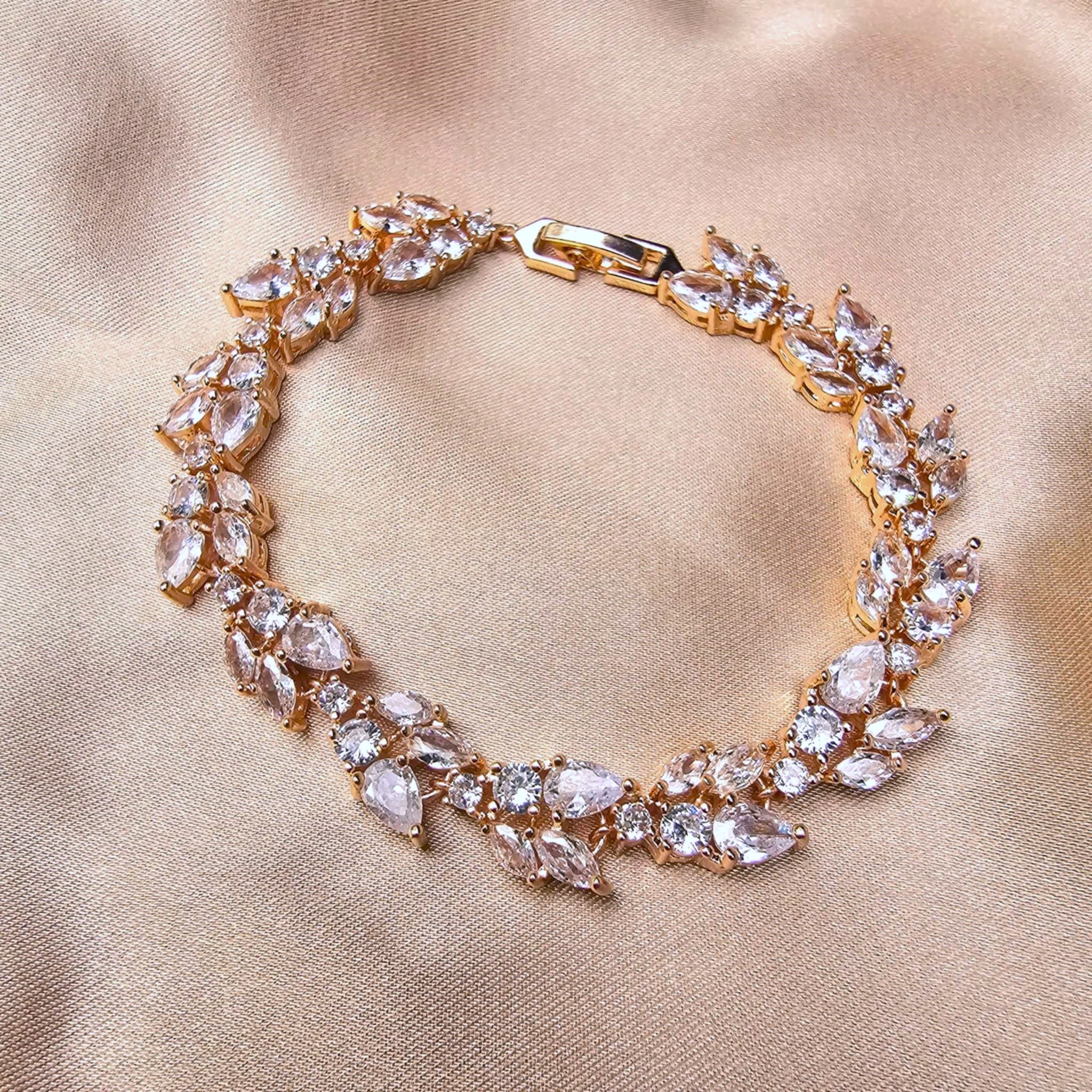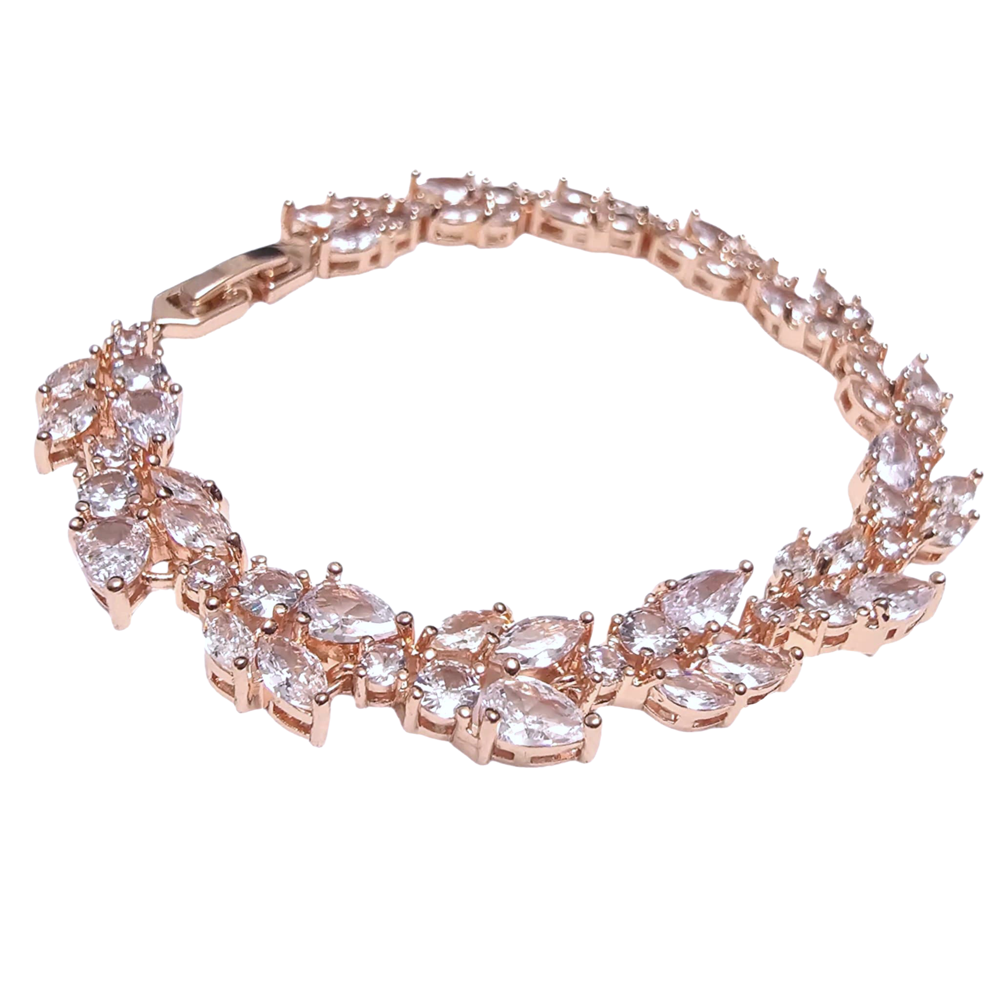 Wykonana w szlachetnym odcieniu różowego złota bransoletka doskonale uzupełnia zarówno tradycyjne, jak i nowoczesne stylizacje ślubne, dodając im niepowtarzalnego uroku.