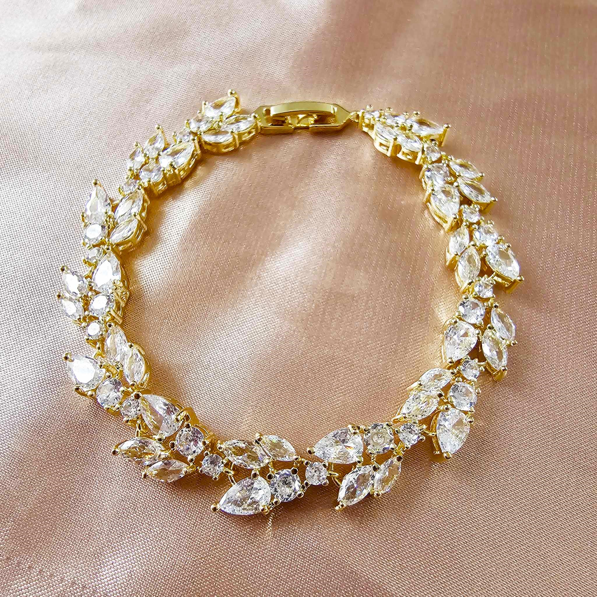 Wykonana w szlachetnym odcieniu złota bransoletka doskonale uzupełnia zarówno tradycyjne, jak i nowoczesne stylizacje ślubne, dodając im niepowtarzalnego uroku.