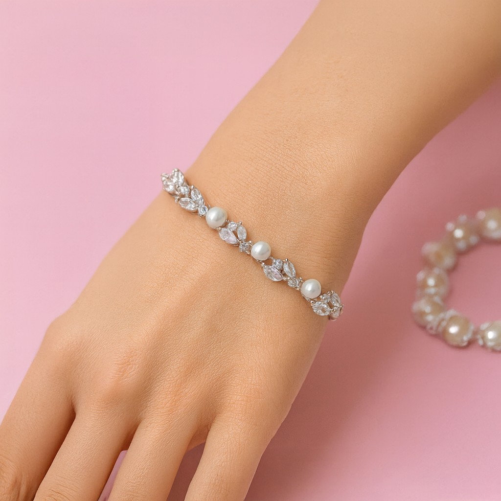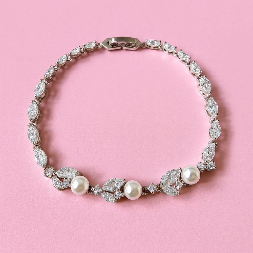 Bransoletka zachwyca połączeniem delikatnych perełek 🤍 i lśniących cyrkonii sześciennych ✨, które pięknie odbijają światło i dodają stylizacji blasku. To idealny wybór na ślub, wesele czy inne uroczystości 💍, a jednocześnie elegancki dodatek do codziennych zestawów.