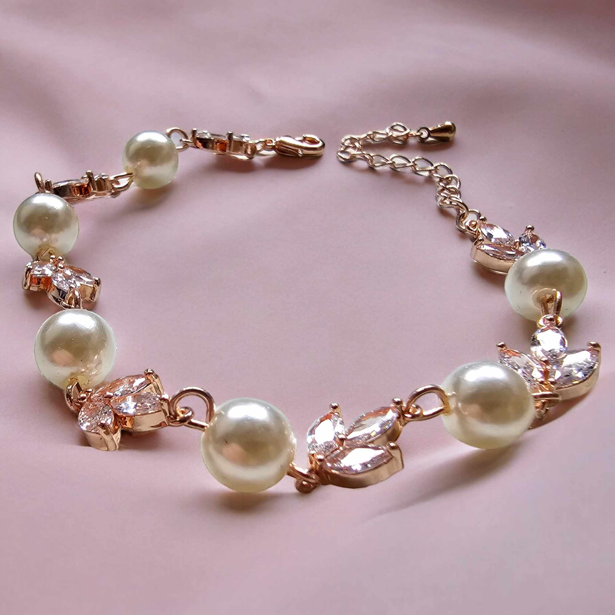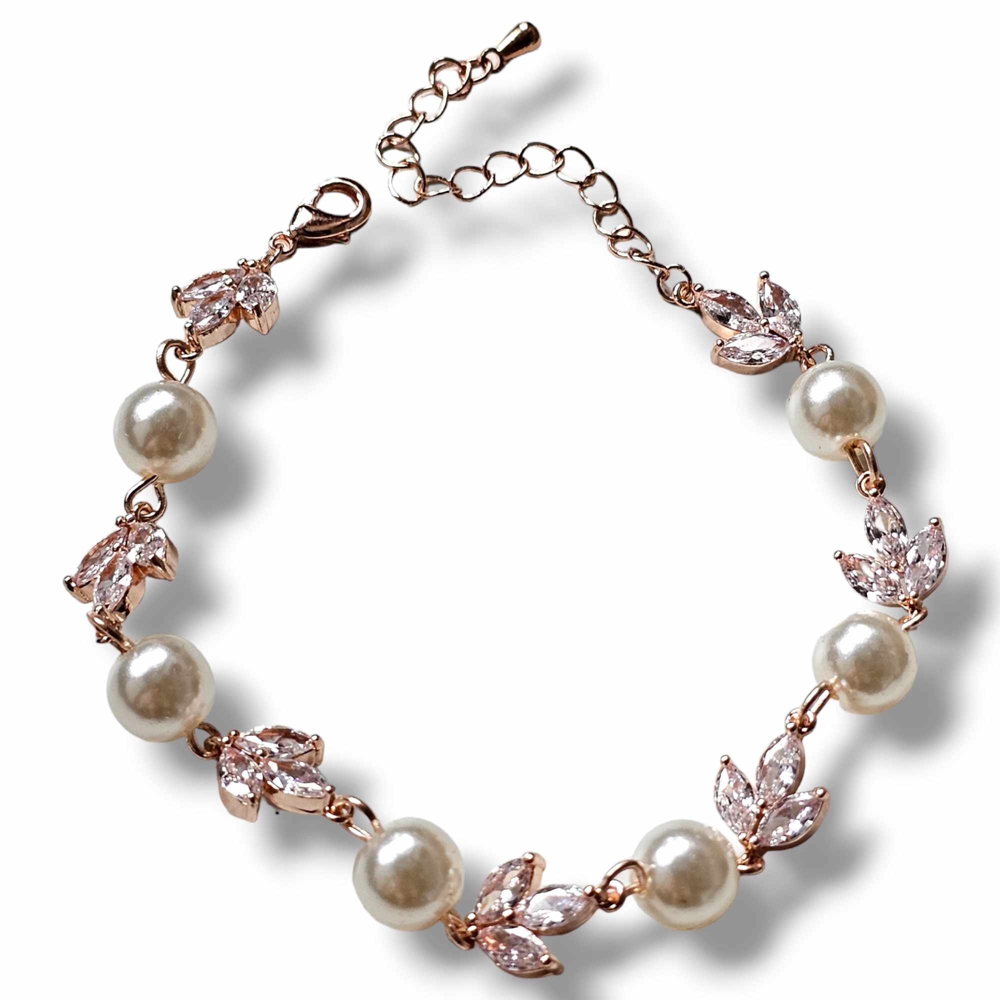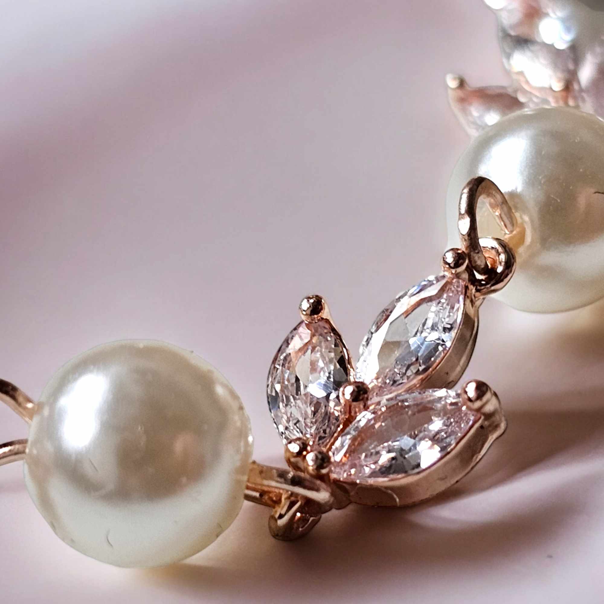 Ekskluzywna biżuteria w kolorze różowego złota z cyrkonią sześcienną i delikatną, beżową perłą to idealny wybór dla każdej kobiety, która chce poczuć się elegancko w ważnym dla siebie dniu.