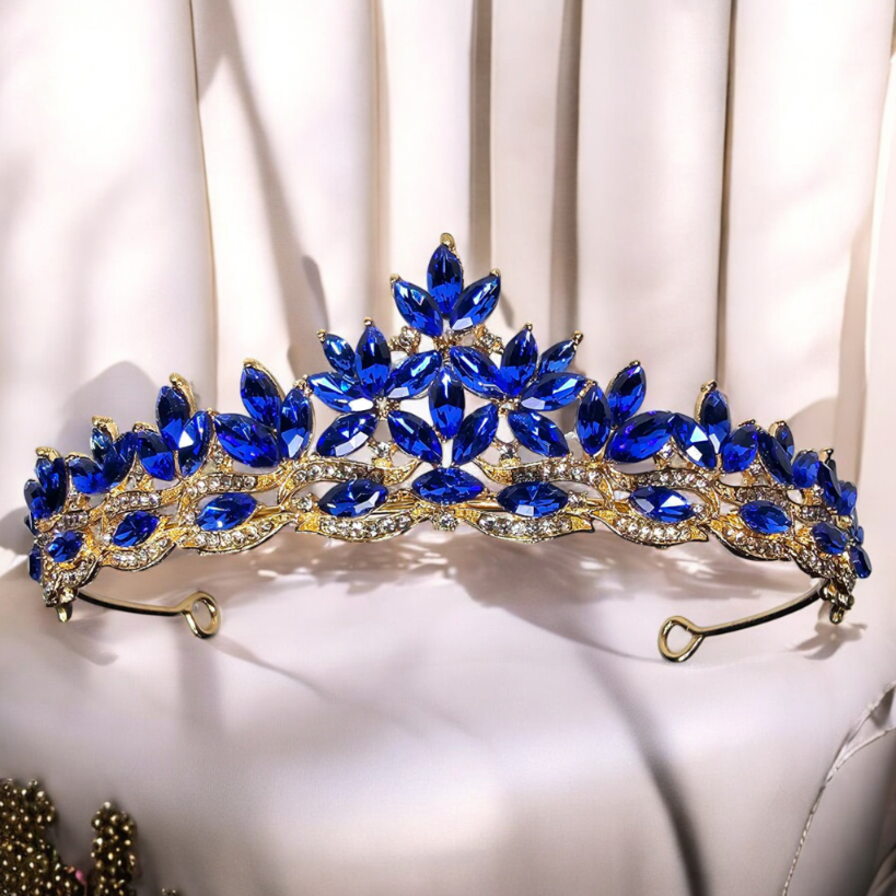 Diadem Ślubny złoty, tiara, korona z chabrowymi kamieniami i Cyrkoniami to niezbędny dodatek dla każdej przyszłej panny młodej pragnącej emanować elegancją i luksusem w dniu swojego ślubu. Został precyzyjnie wykonany z dbałością o każdy detal, co podkreśla jego wyjątkowy design. Chabrowe kamienie i Cyrkonia dodają mu subtelnego blasku, idealnie komponując się z kolorystyką złota.