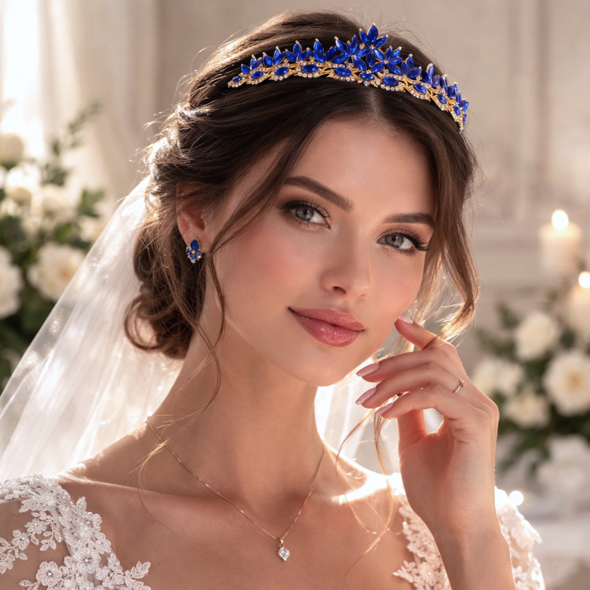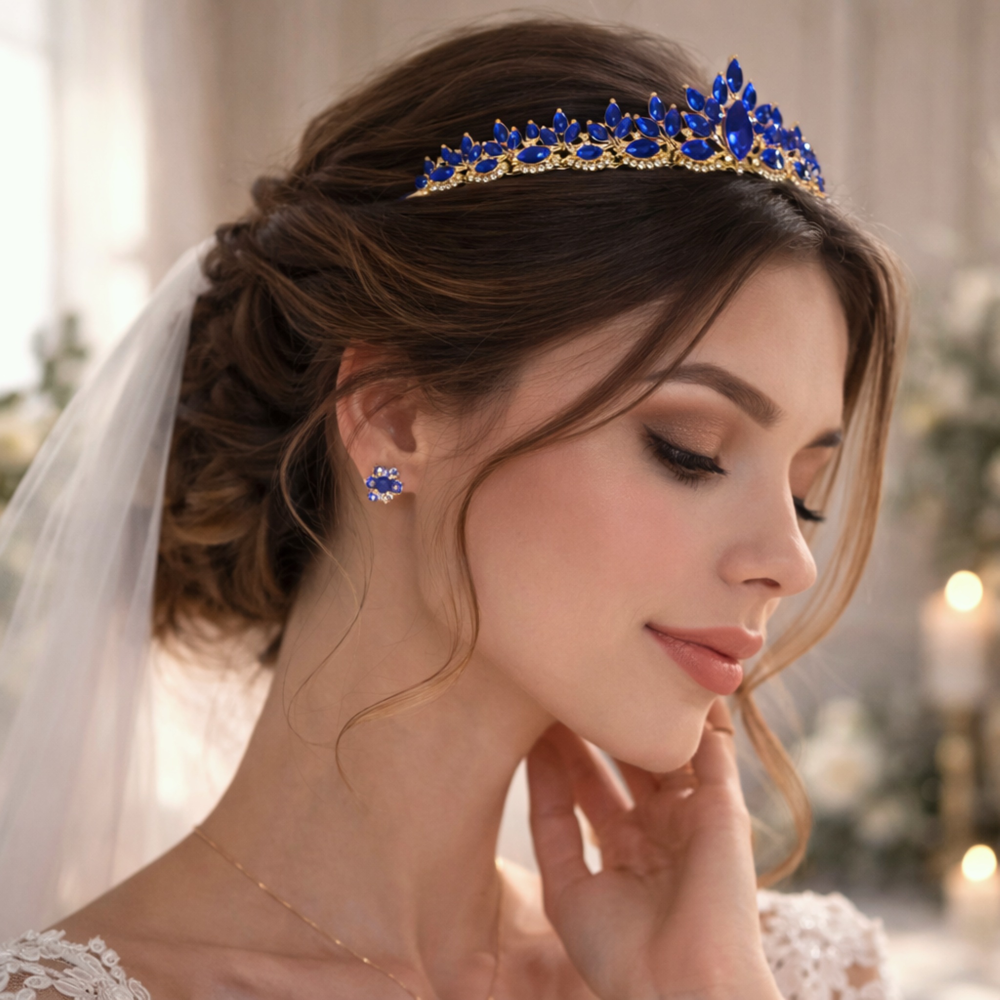Ten złoty diadem ślubny, określany również jako tiara, został zaprojektowany dla Panny Młodej, która poszukuje elegancji z wyrazistym, królewskim akcentem. Intensywny odcień Royal Blue – określany także jako królewski kobalt lub głęboki chaber jubilerski – nadaje stylizacji prestiżowy charakter i wyjątkową głębię koloru.