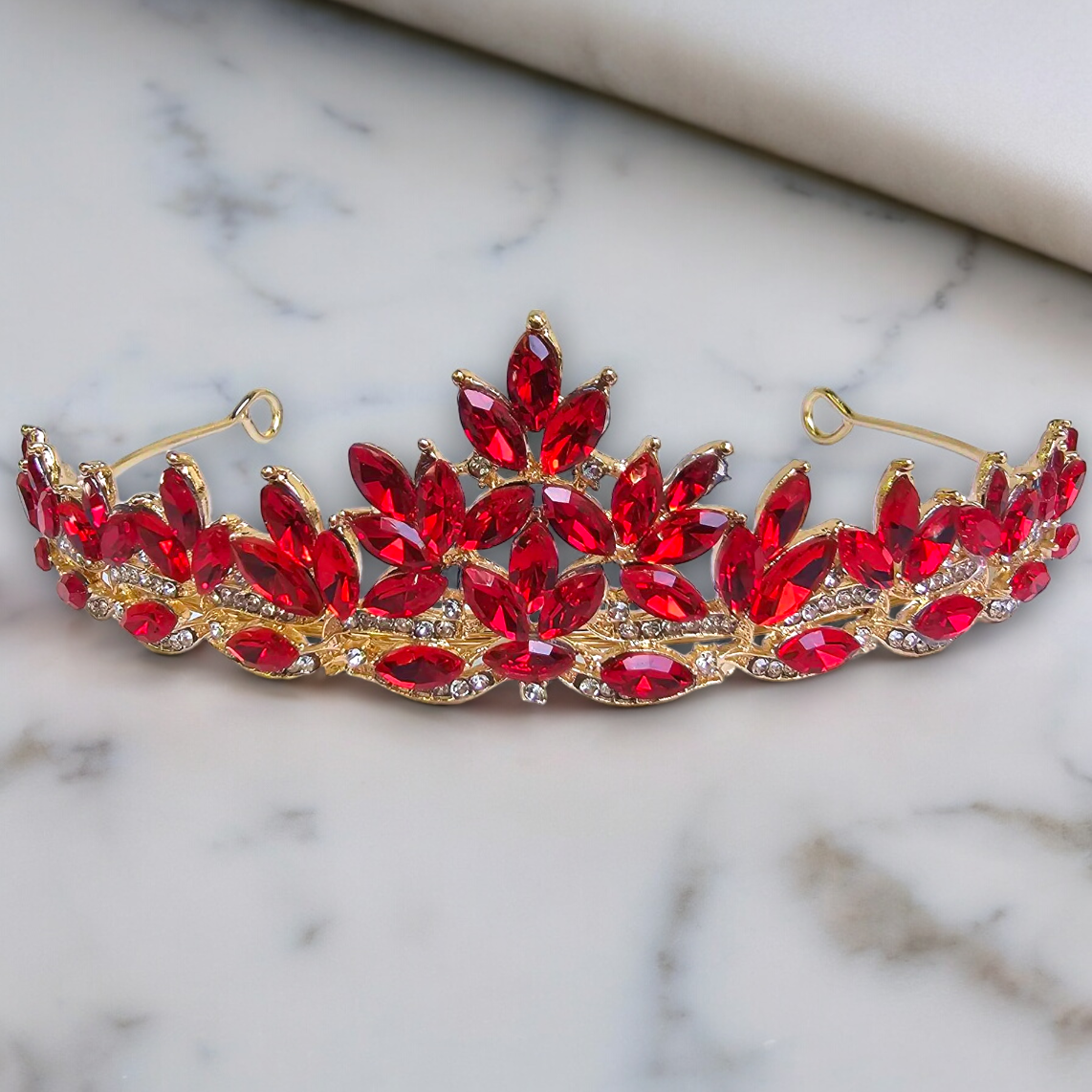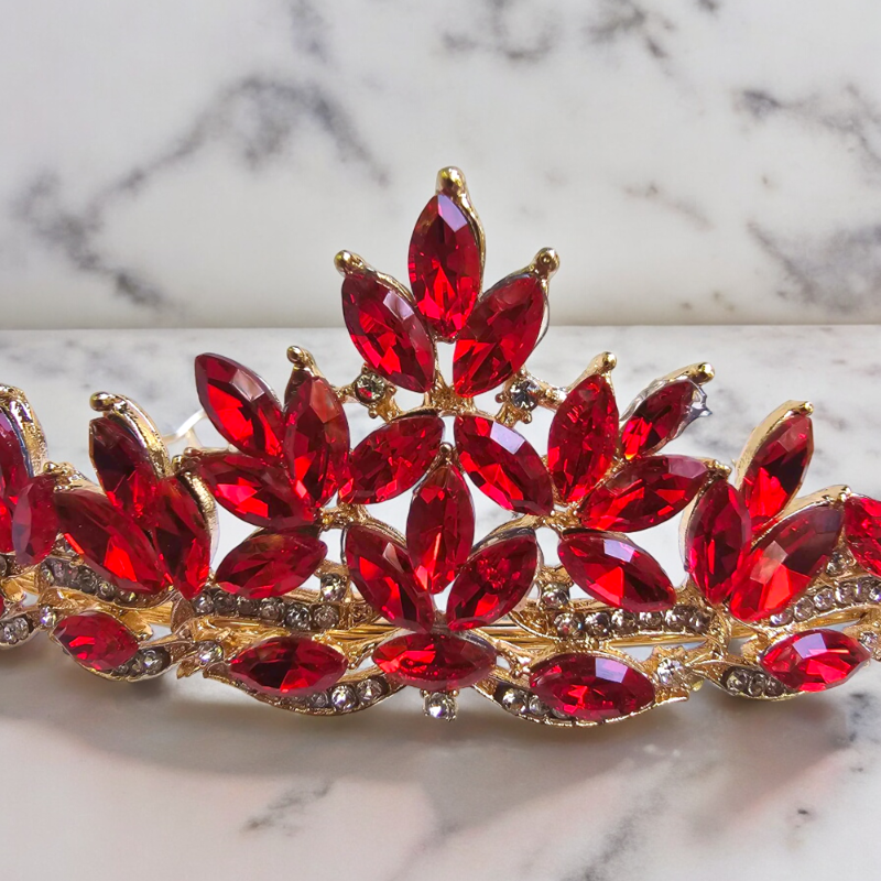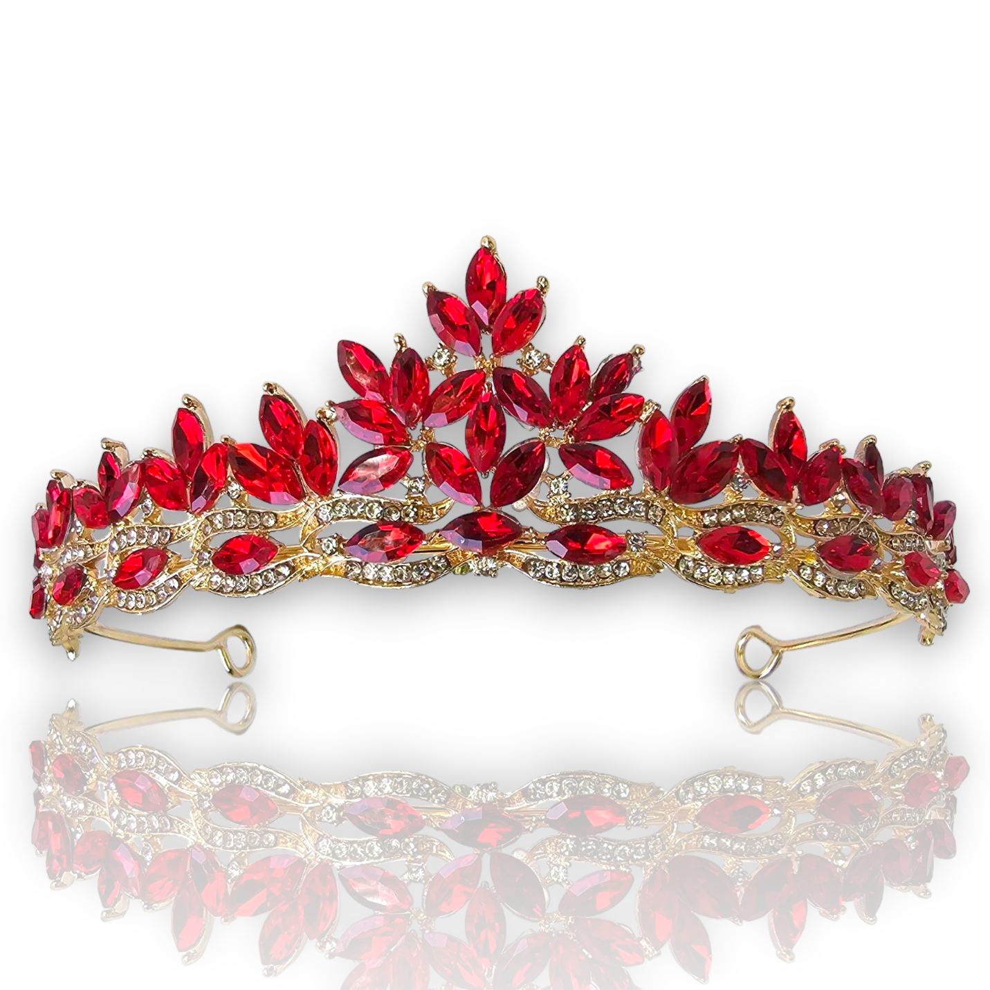 Diadem Ślubny złoty, tiara, korona z rubinowymi kamieniami i Cyrkoniami to niezbędny dodatek dla każdej przyszłej panny młodej pragnącej emanować elegancją i luksusem w dniu swojego ślubu. Został precyzyjnie wykonany z dbałością o każdy detal, co podkreśla jego wyjątkowy design. Rubinowe kamienie i Cyrkonia dodają mu subtelnego blasku, idealnie komponując się z kolorystyką złotą.