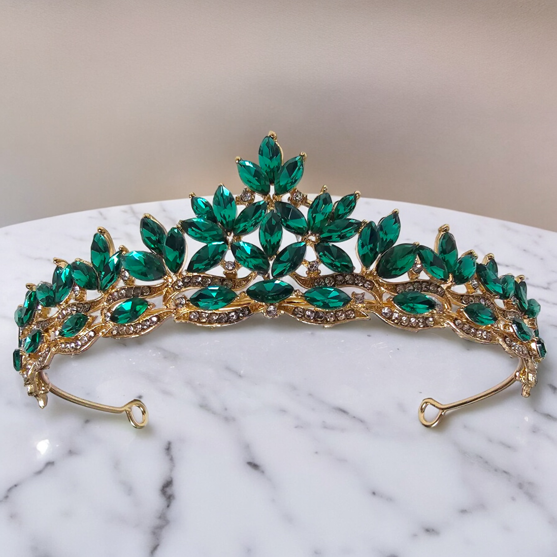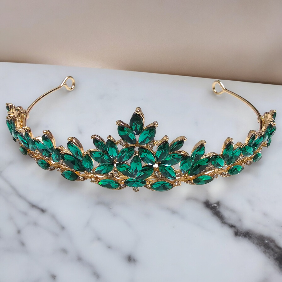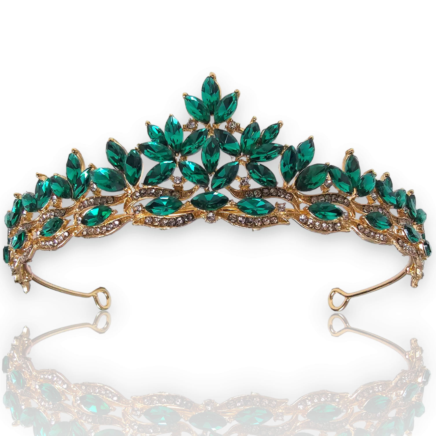 Diadem Ślubny złoty, tiara, korona ze szmaragdowymi kamieniami i Cyrkoniami to niezbędny dodatek dla każdej przyszłej panny młodej pragnącej emanować elegancją i luksusem w dniu swojego ślubu. Został precyzyjnie wykonany z dbałością o każdy detal, co podkreśla jego wyjątkowy design. Szmaragdowe kamienie i Cyrkonia dodają mu subtelnego blasku, idealnie komponując się z kolorystyką złotą.