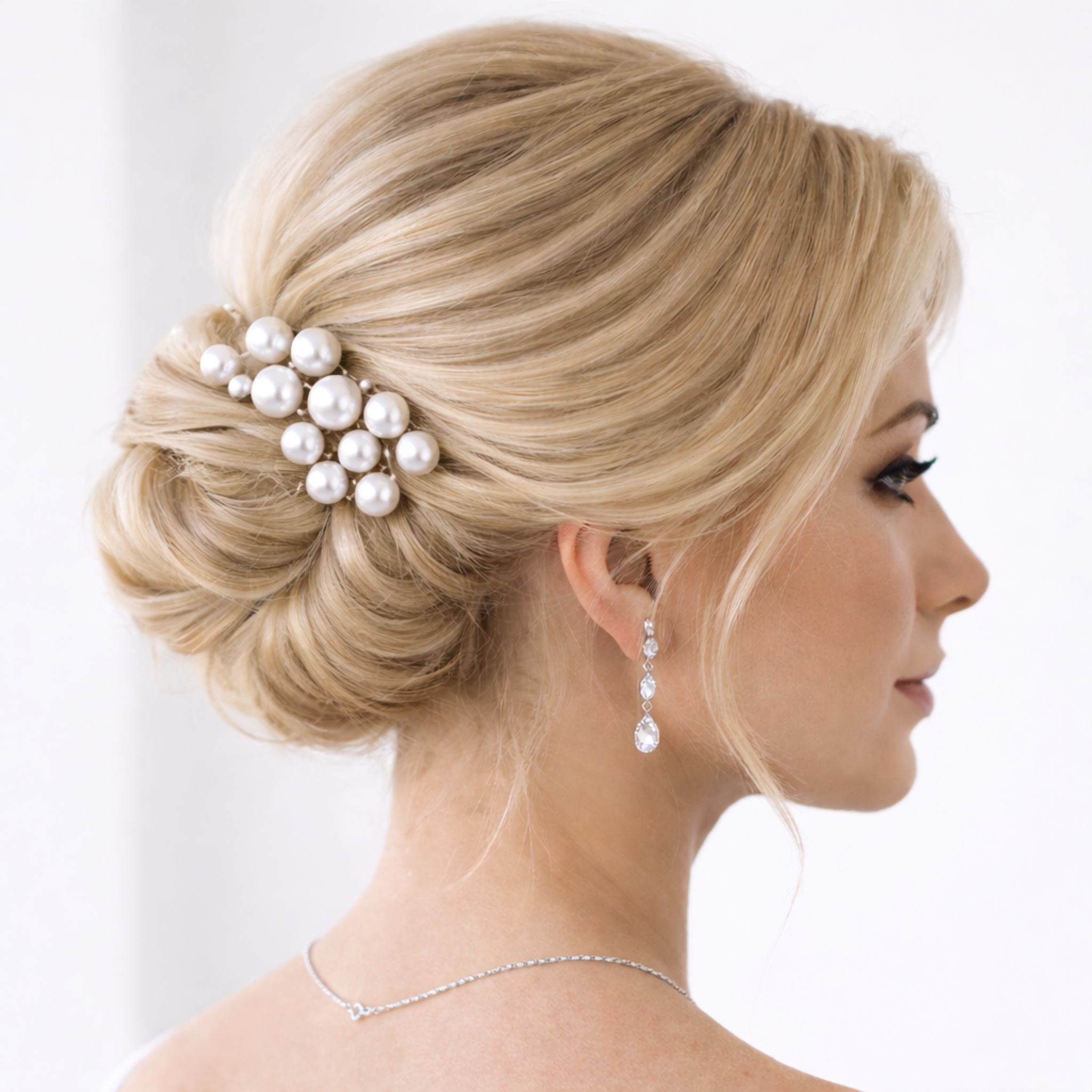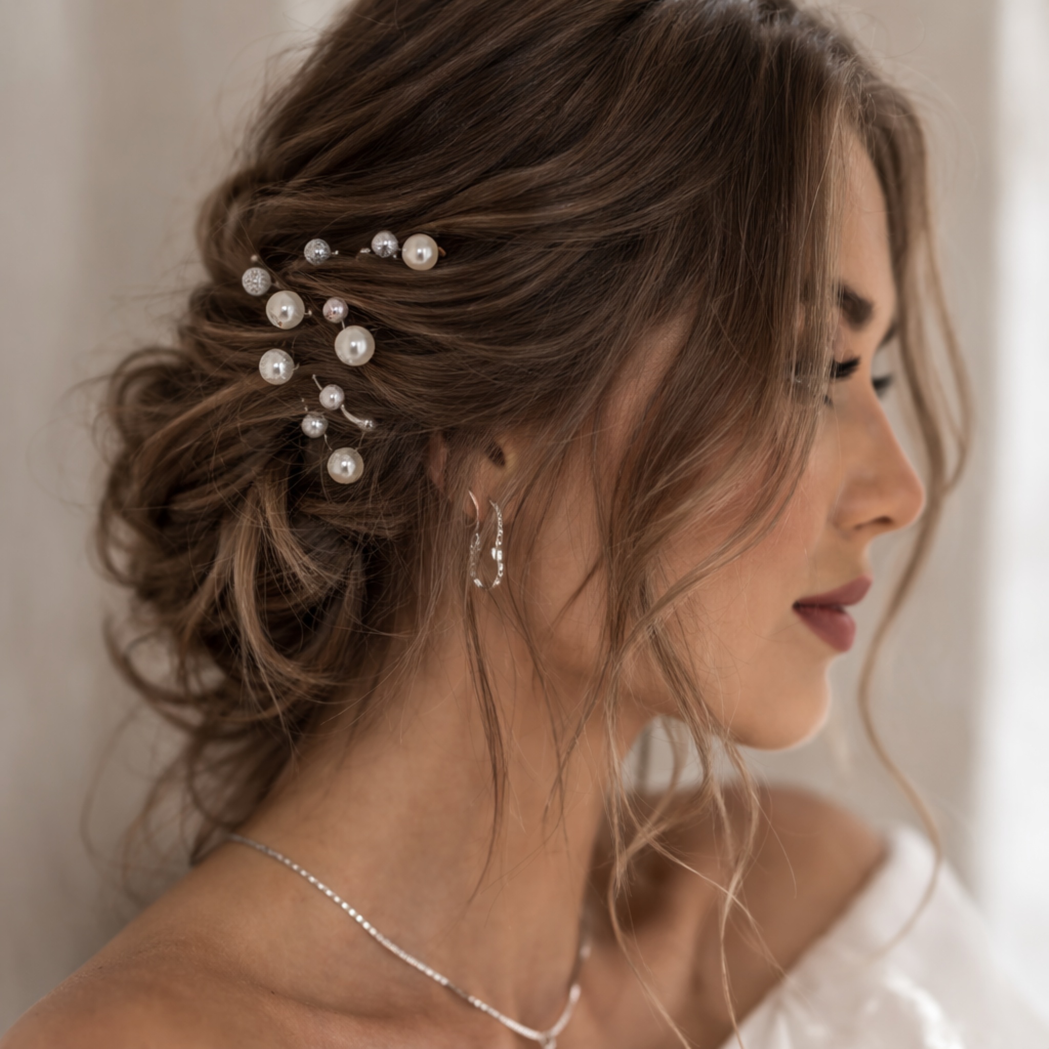 Zestaw 17 kokówek pozwala stworzyć przestrzenną, elegancką kompozycję — zarówno w klasycznym koku, romantycznych falach, jak i nowoczesnych półupięciach. Swobodne rozmieszczenie kokówek umożliwia stylistom fryzur idealne dopasowanie ozdób do charakteru uczesania oraz wizji Panny Młodej.