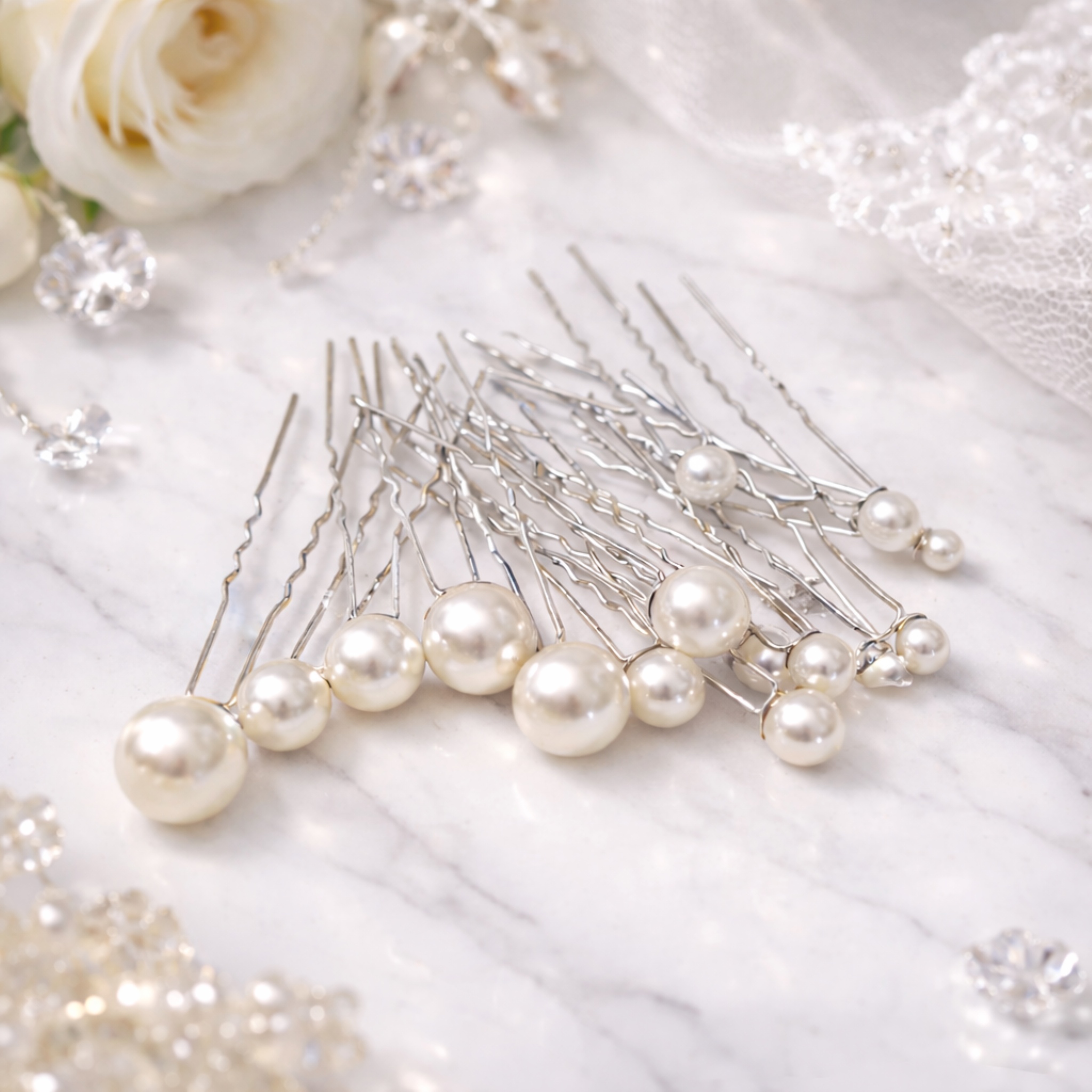 Elegancki zestaw 17 srebrnych kokówek ślubnych o delikatnym, biżuteryjnym charakterze. Białe perły osadzone na smukłej, srebrnej formie tworzą subtelny detal, który pięknie rozświetla fryzurę i dodaje jej wyjątkowej lekkości.