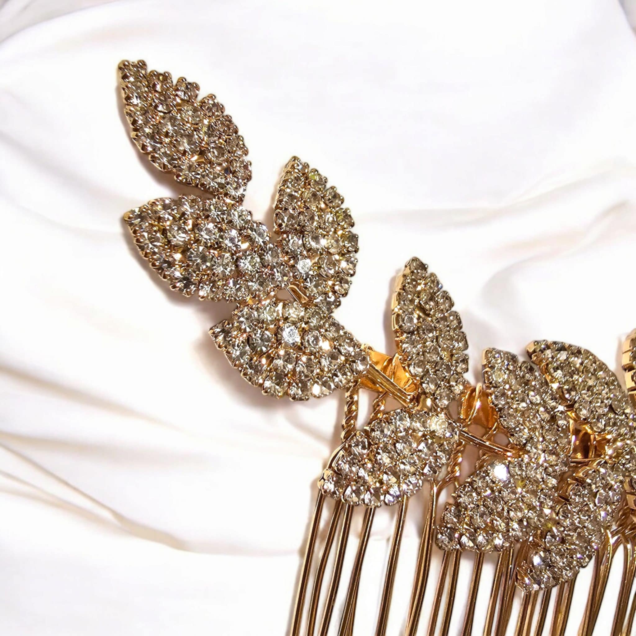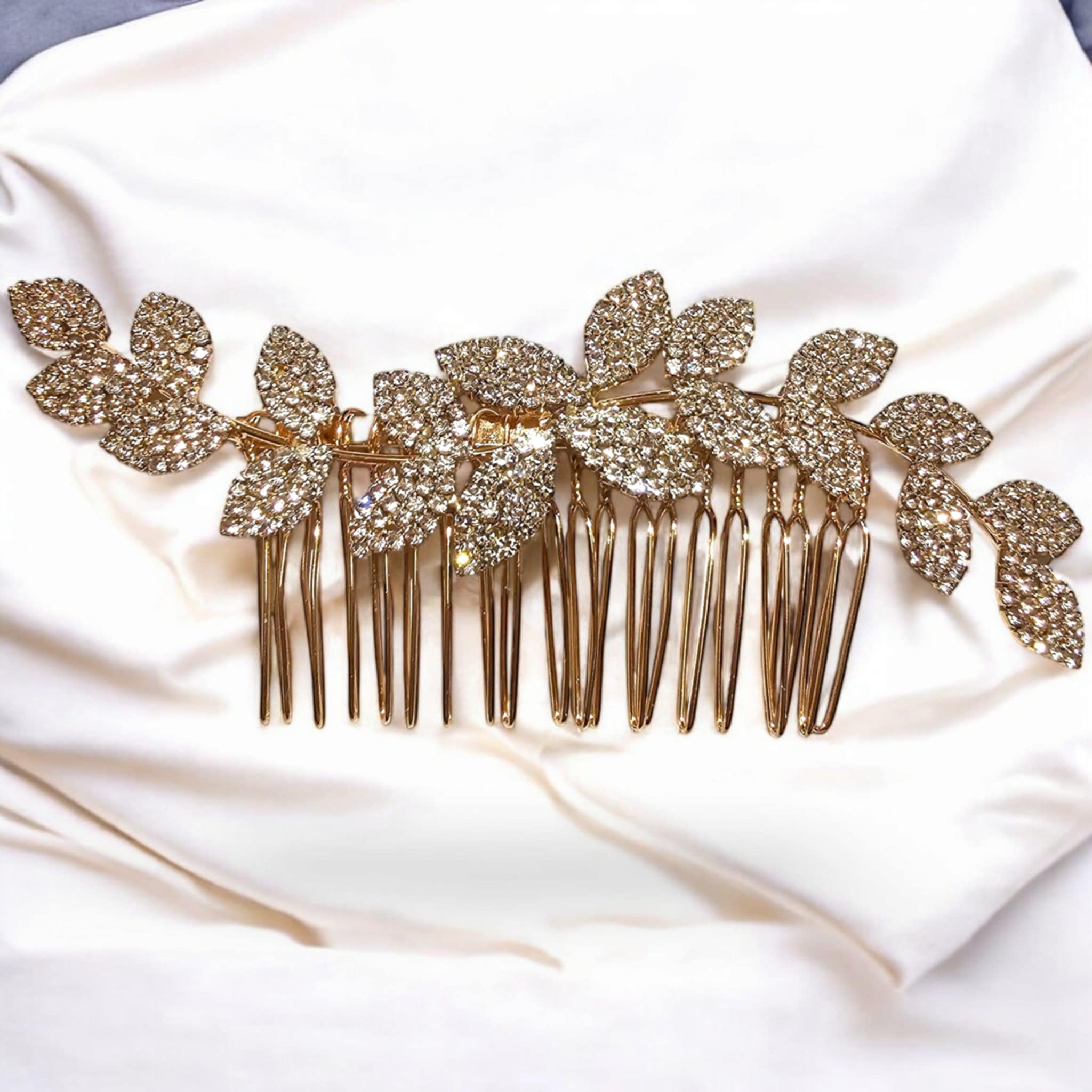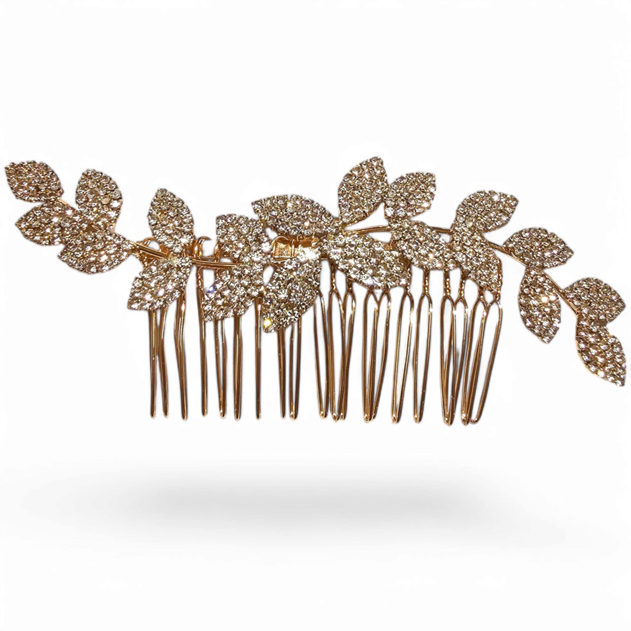 Wykonany w kolorze złota, grzebień jest pokryty pięknymi cyrkoniami, które dodają mu blasku i elegancji.