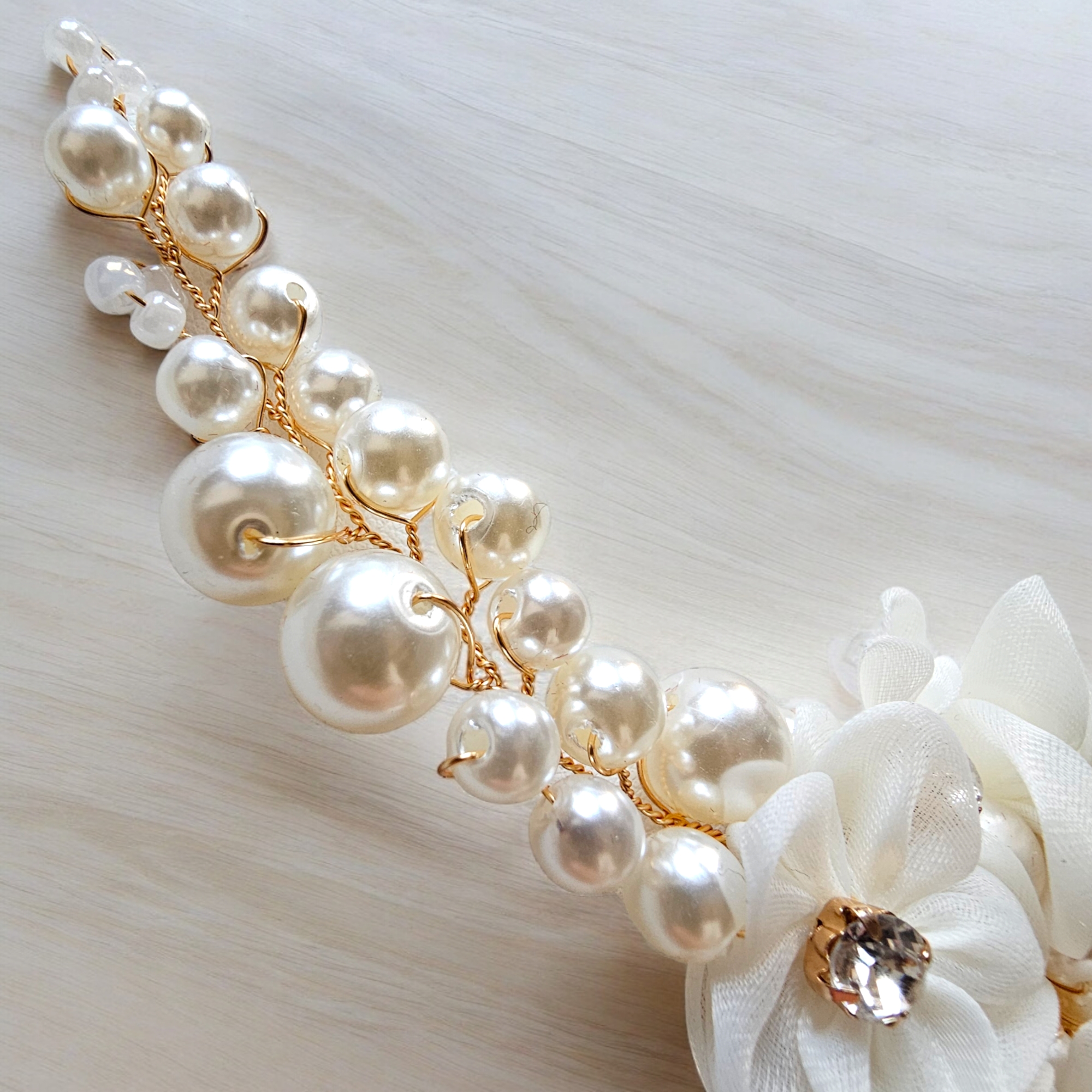 Produkt charakteryzuje się wysoką jakością wykonania oraz pięknym designem, który idealnie dopasuje się do stylizacji na wielkie wydarzenia. Wyjątkowe kwiatowe detale wypełnione błyszczącymi cyrkoniami dodają blasku i subtelności. Dodatkowo, grzebień ozdobiony jest pięknymi perełkami na złotym druciku, które nadają mu jeszcze bardziej wyrafinowanego wyglądu.