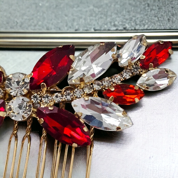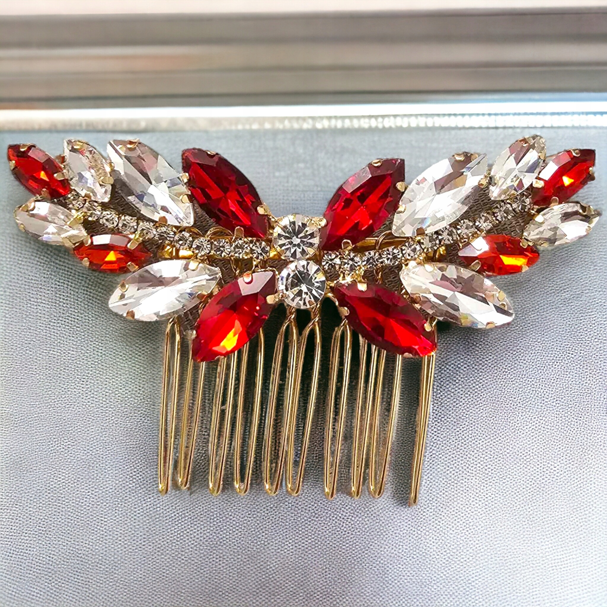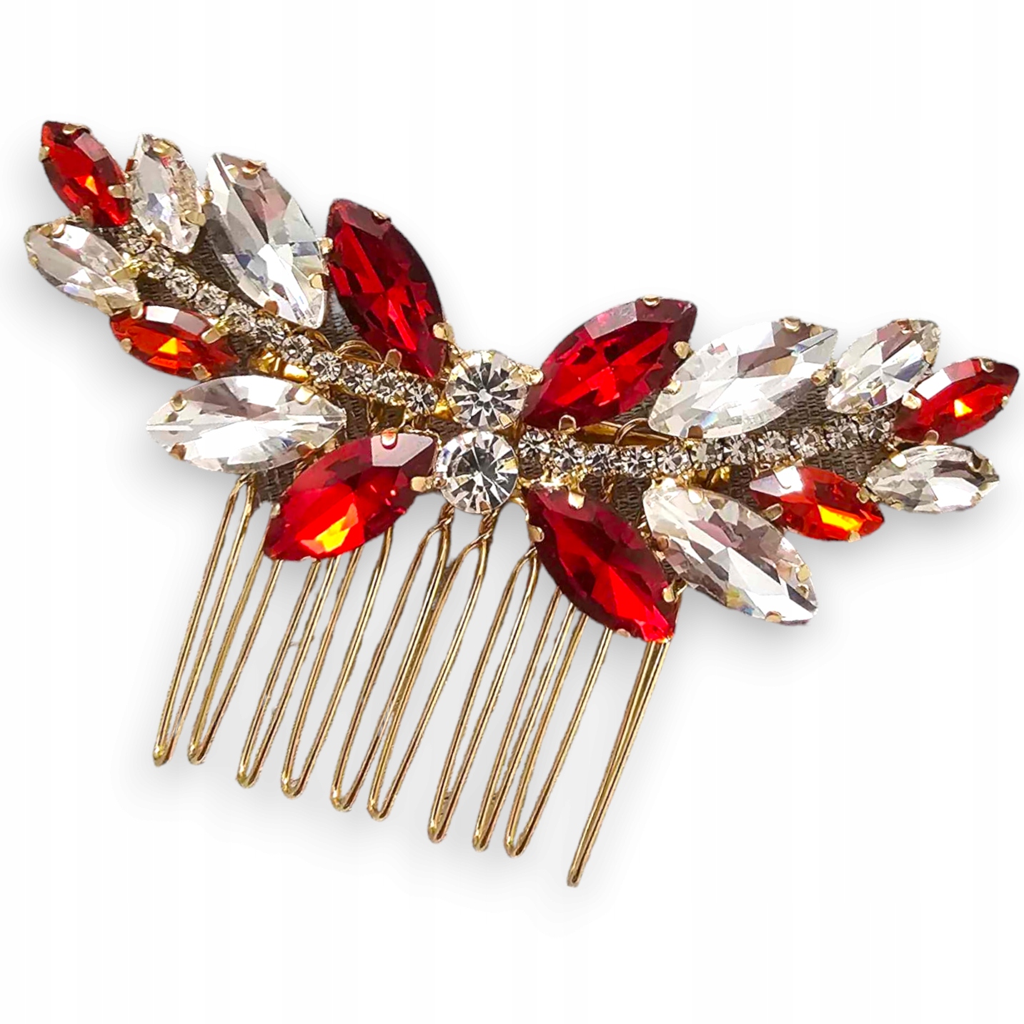 Ten uroczy grzebień został ozdobiony kamieniami w pięknym odcieniu rubinu, co dodaje mu elegancji i przyciąga spojrzenia. Cyrkonie, które go zdobią, nadają mu delikatnego blasku i sprawiają, że błyszczysz na każdym kroku.