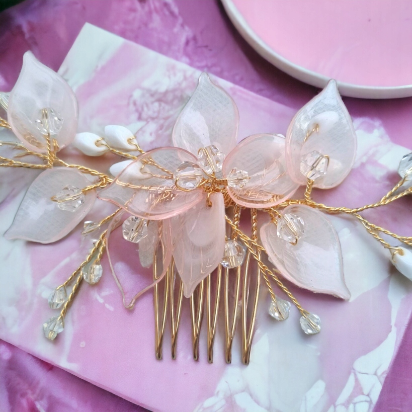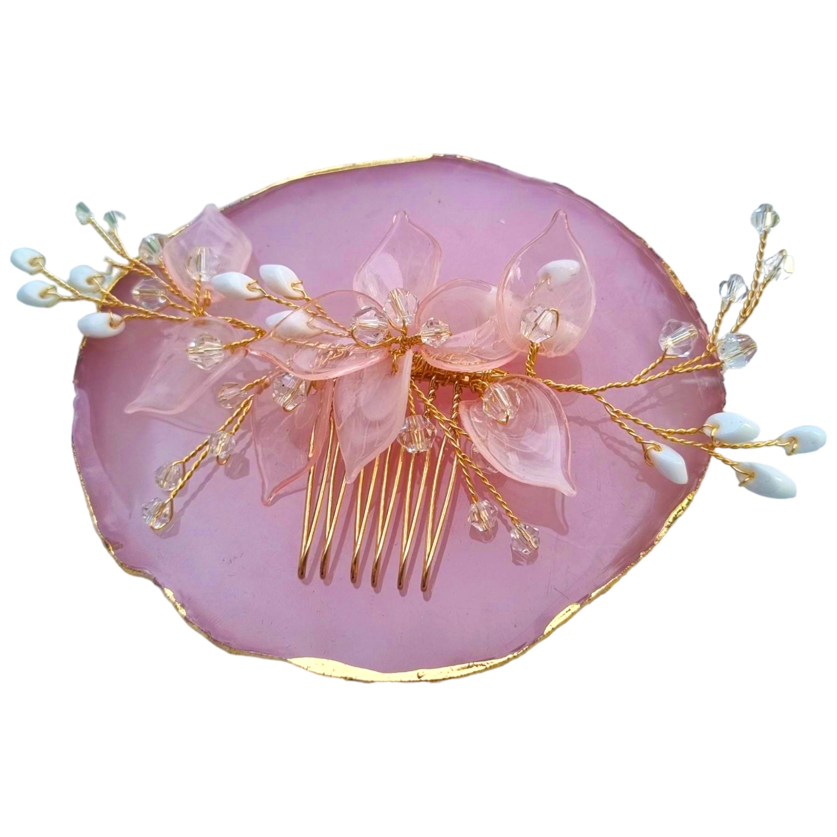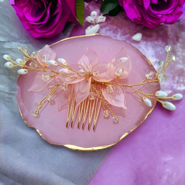 Przedstawiamy Państwu przepiękny grzebyk ślubny w kolorze złota ozdobiony różowymi kwiatami. Jest to wspaniałe i eleganckie rozwiązanie dla przyszłej panny młodej lub na wyjątkowe wyjścia. Ta efektowna ozdoba wspaniale uzupełni każdą stylizację.