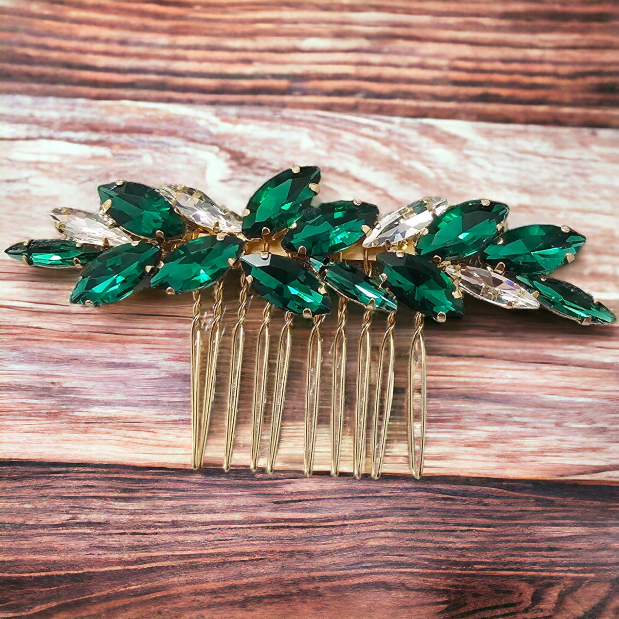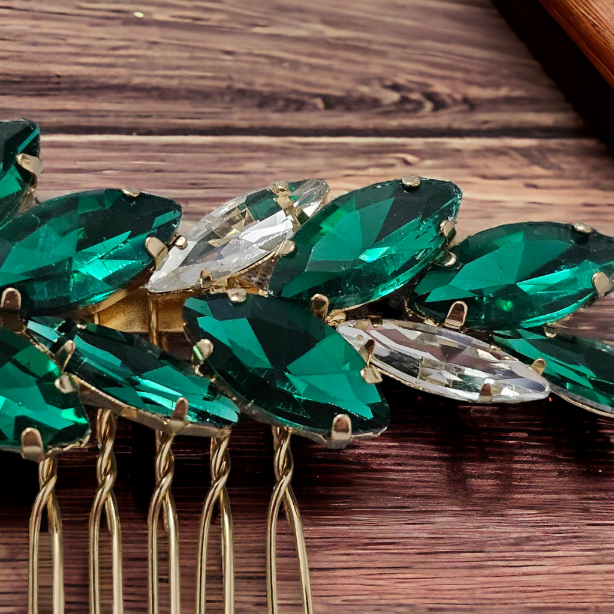 Przedstawiamy złoty grzebyk ozdobiony kamieniami o urokliwym szmaragdowym odcieniu. Ten wyjątkowy dodatek będzie idealnym towarzyszem podczas ślubu, studniówki czy sylwestra.
