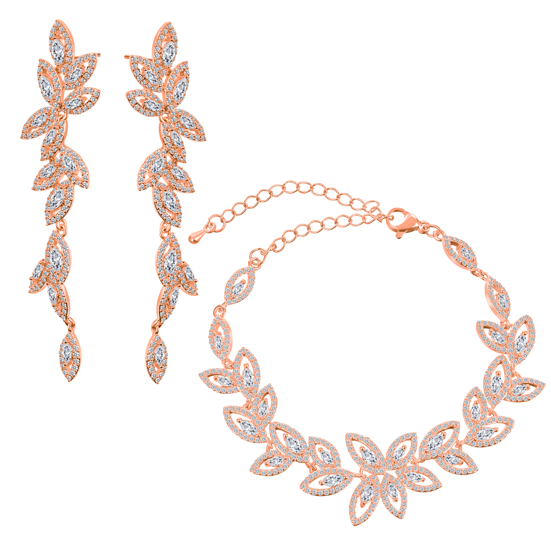 Zapraszam do zakupu tego pięknego kompletu premium w kolorze różowego złota. To doskonały wybór dla wszystkich, którzy chcą dodać blasku i elegancji swojej stylizacji. Biżuteria będzie przyciągać uwagę i dodawać uroku i blasku każdej kobiecie.