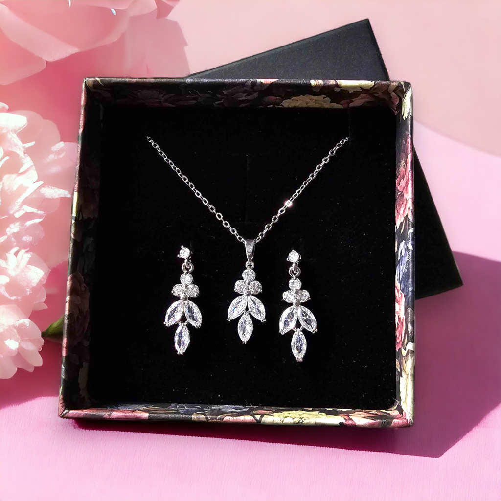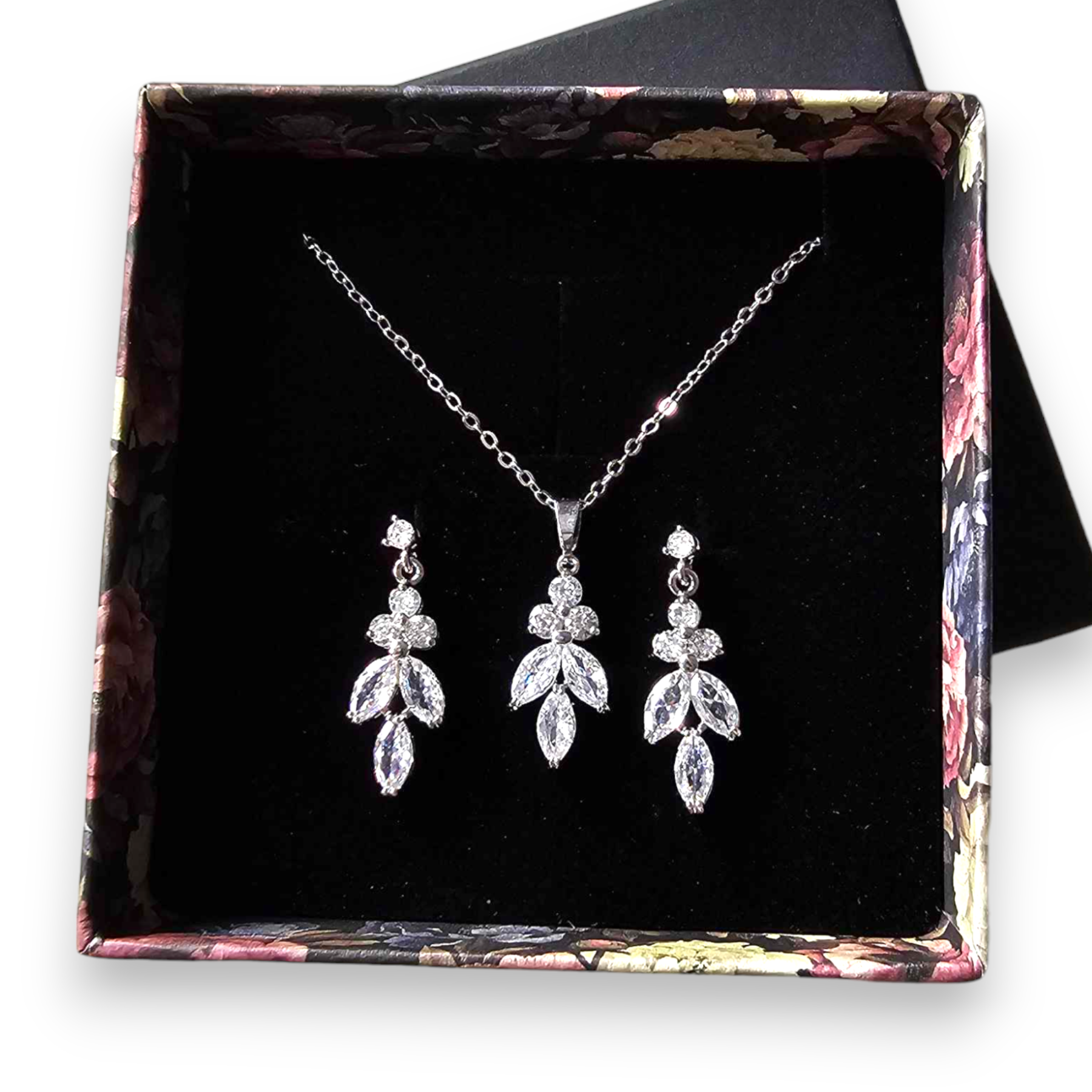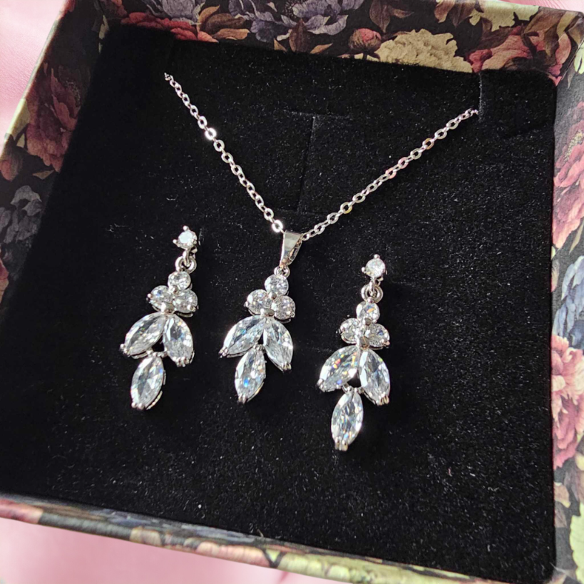Mocno odbijające cyrkonie sześciennie sprawiają, że zestaw jest widoczny i przyciągający uwagę, ale w bardzo subtelny sposób. Elementy biżuterii są delikatne i wysublimowane. Kolczyki posiadają zapięcie typu sztyft, które zapewniają bezpieczne noszenie.