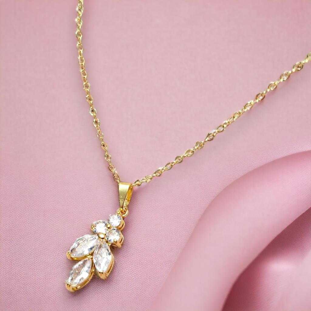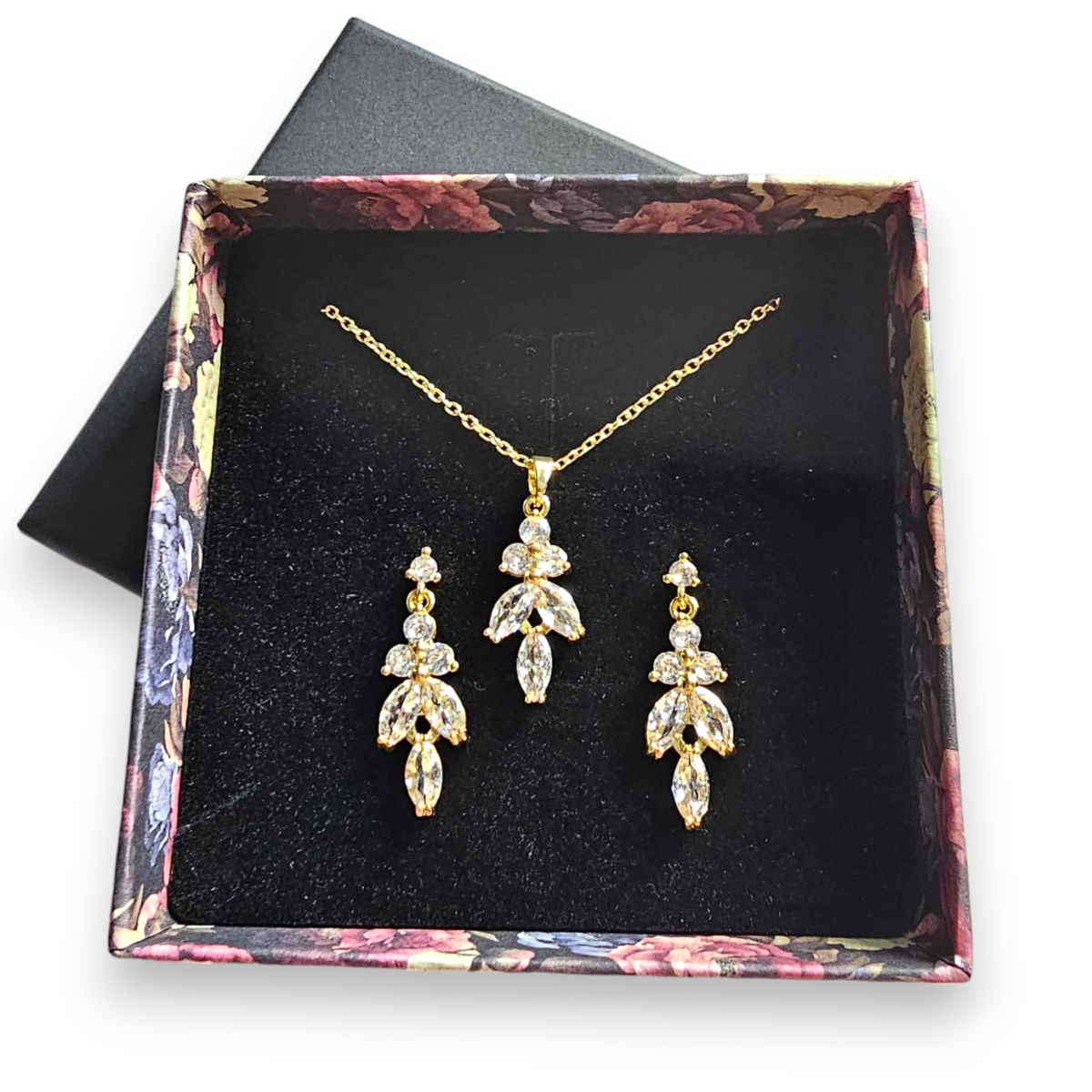 Komplet składa się z 2 elementów: łańcuszka z zawieszką i kolczyków. Biżuteria została wykonana z platerowanej miedzi, która jest bezpieczna dla skóry, nie zawiera kadmu, niklu ani ołowiu, co sprawia, że jest hipoalergiczna.
