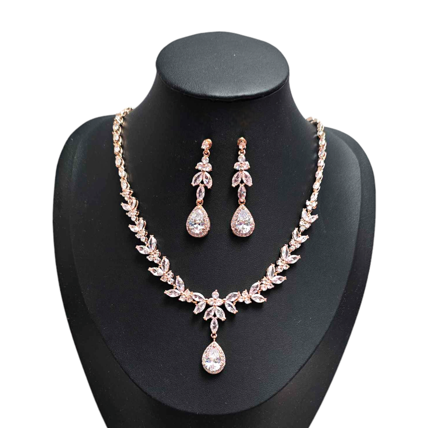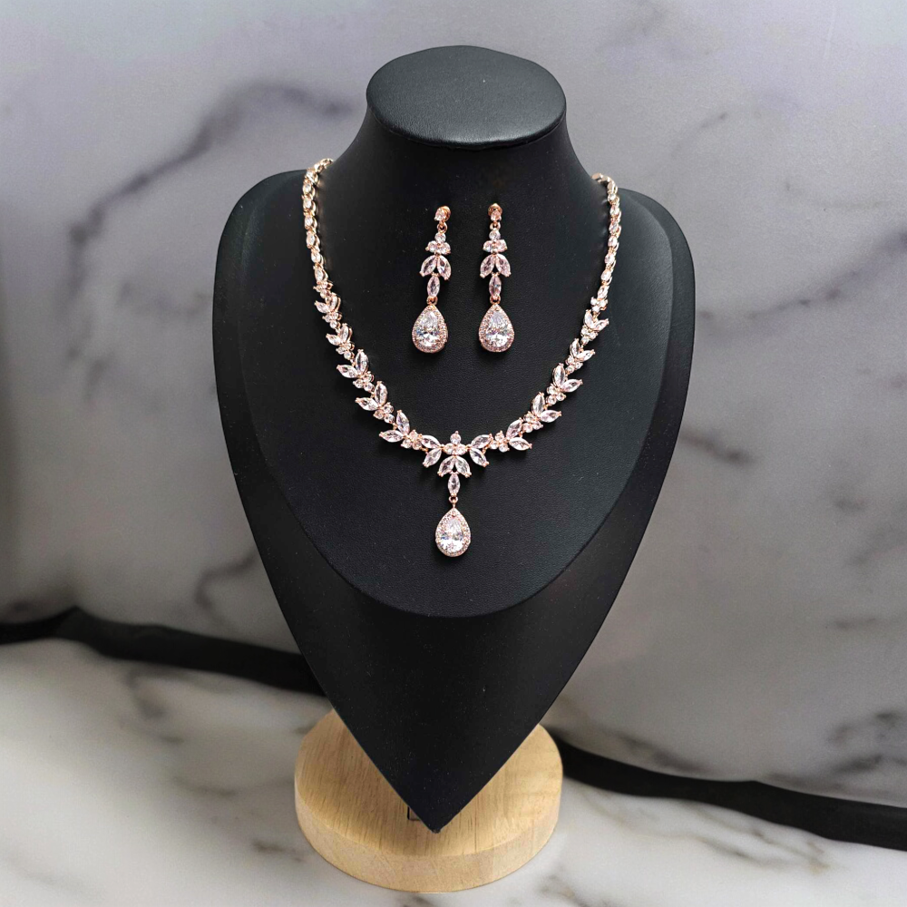 Ekskluzywny komplet biżuterii z cyrkonią sześcienną w kolorze różowego złota to idealny wybór dla kobiet pragnących poczuć się wyjątkowo. Składający się z naszyjnika i kolczyków komplet biżuterii zapewnia wysoki poziom elegancji i wyrafinowania.