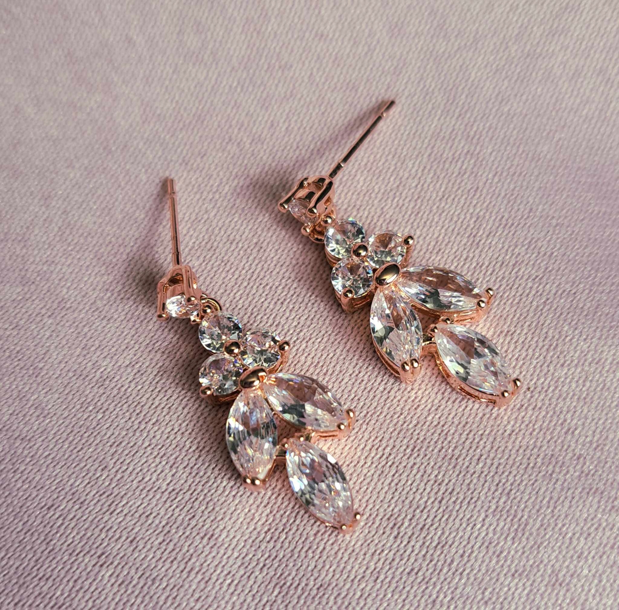 Mocno odbijające cyrkonie sześciennie sprawiają, że zestaw jest widoczny i przyciągający uwagę, ale w bardzo subtelny sposób. Elementy biżuterii są delikatne i wysublimowane. Kolczyki posiadają zapięcie typu sztyft, które zapewniają bezpieczne noszenie.