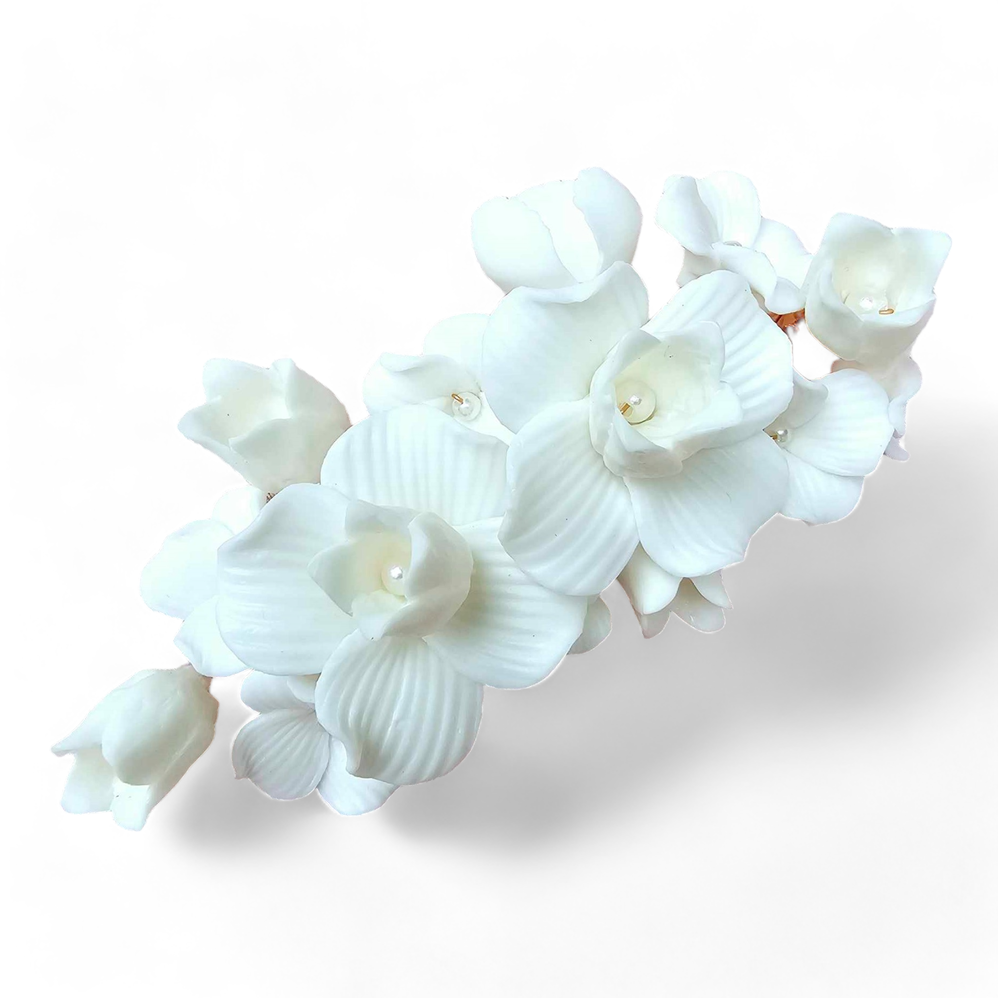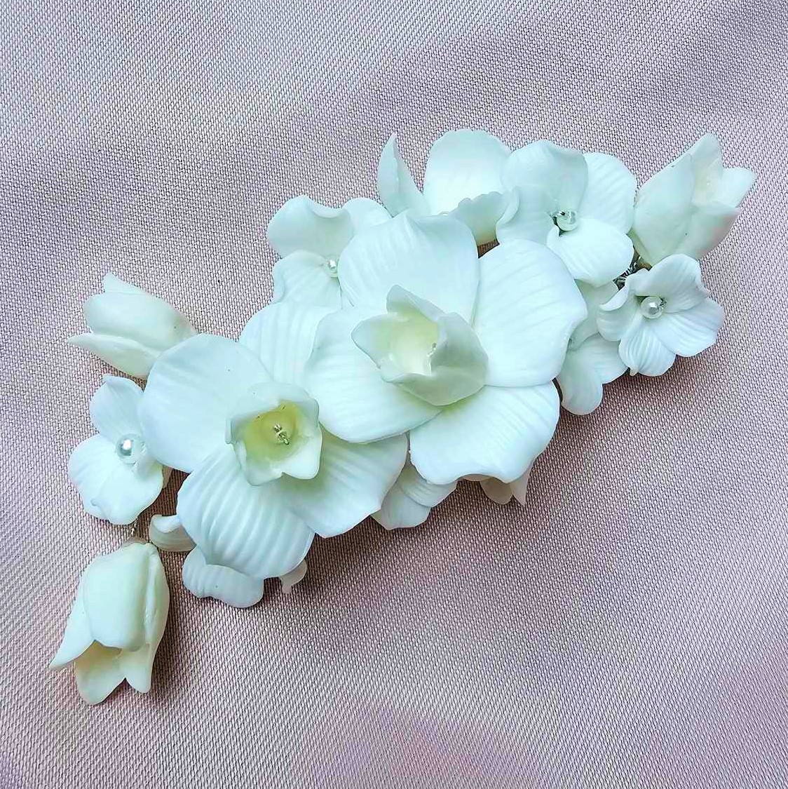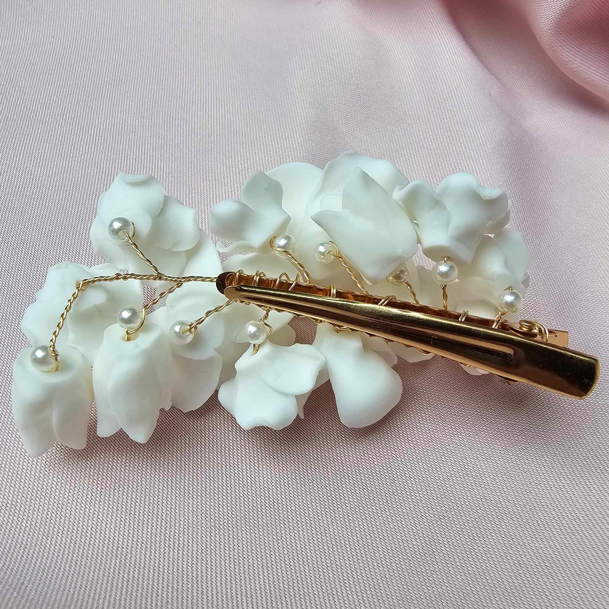 Spinka została wykonana ręcznie z pięknych, porcelanowych, białych kwiatków i perełek. Jest bardzo lekka i wygodna w noszeniu.