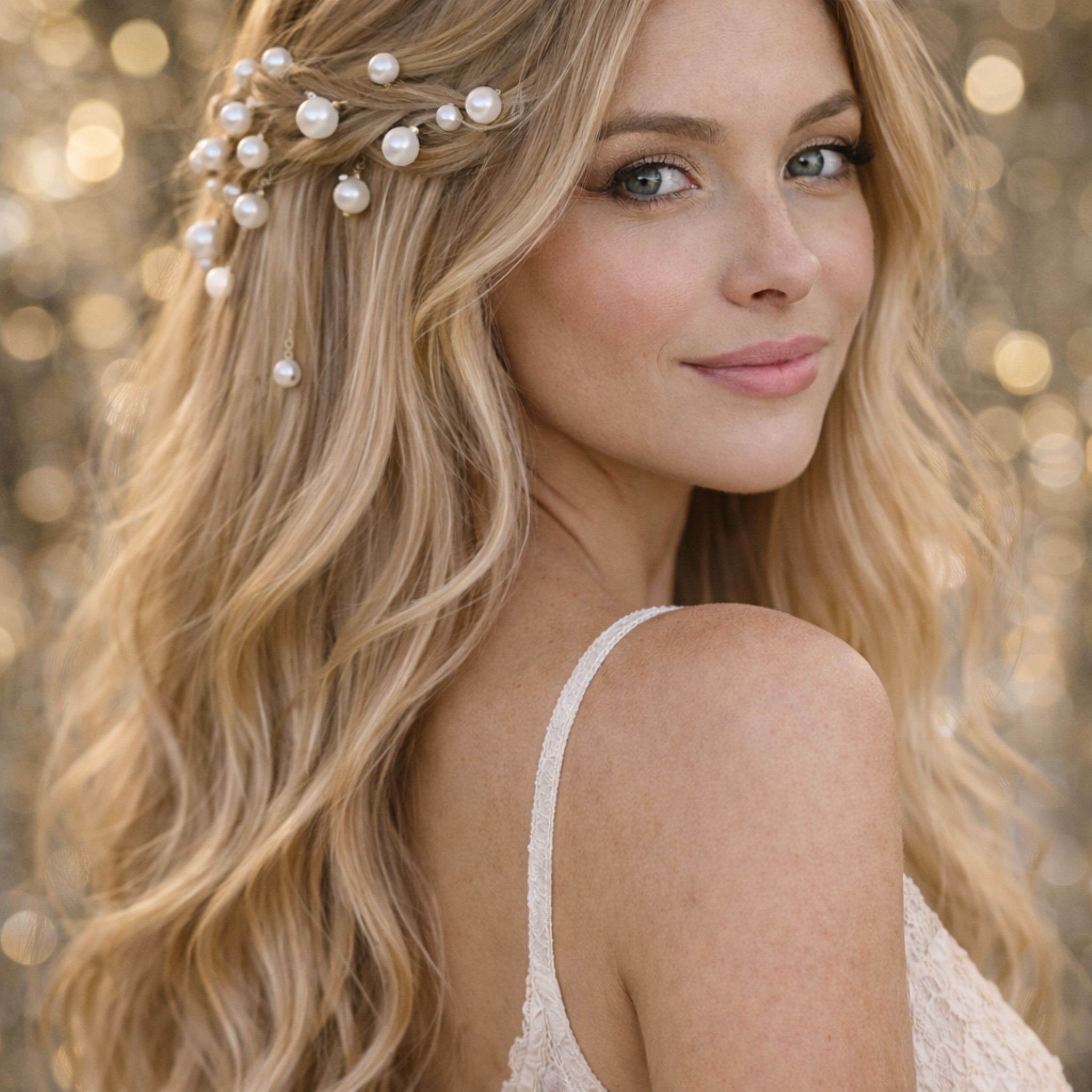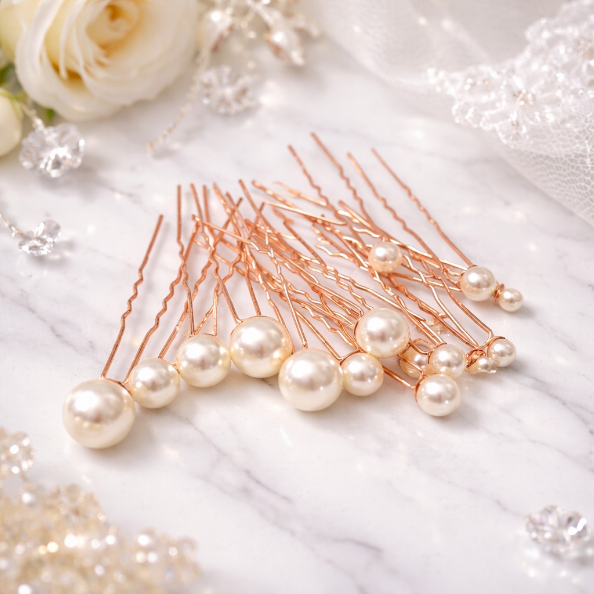 Eleganckie kokówki ślubne do włosów w odcieniu różowego złota (rose gold), ozdobione subtelnymi białymi perłami. Zestaw 17 sztuk pozwala stworzyć harmonijne i dopracowane upięcie – od romantycznych fal, przez styl boho, aż po klasyczny kok ślubny.
