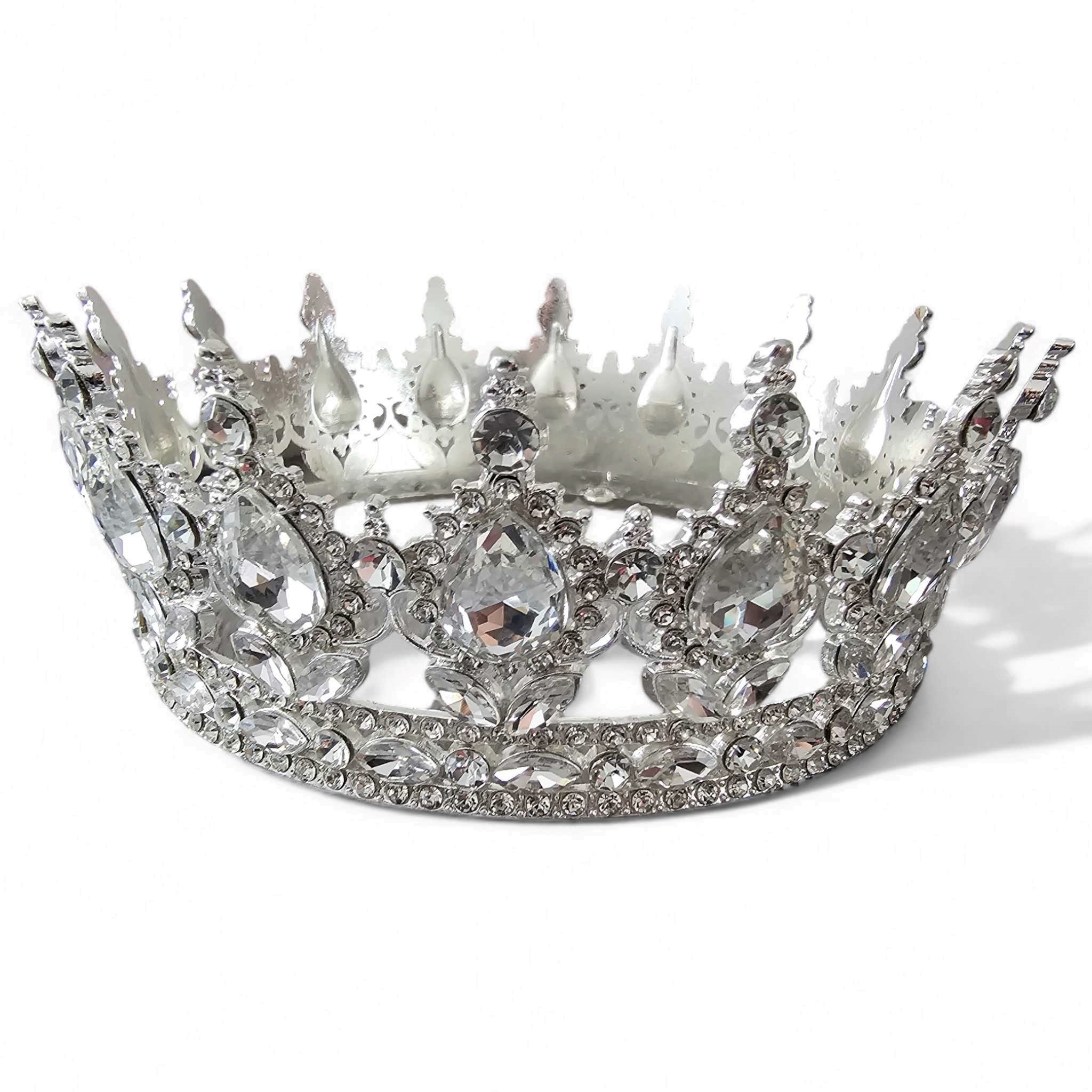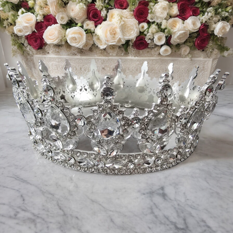 Nasza tiara ma średnicę 12,5 cm i wysokość 5,5 cm, co sprawia, że jest widoczna i efektowna. Jej królewska aura podkreślona jest dużymi zdobnymi kamieniami i przezroczystymi cyrkoniami, które odbijają światło, tworząc efektowny blask.