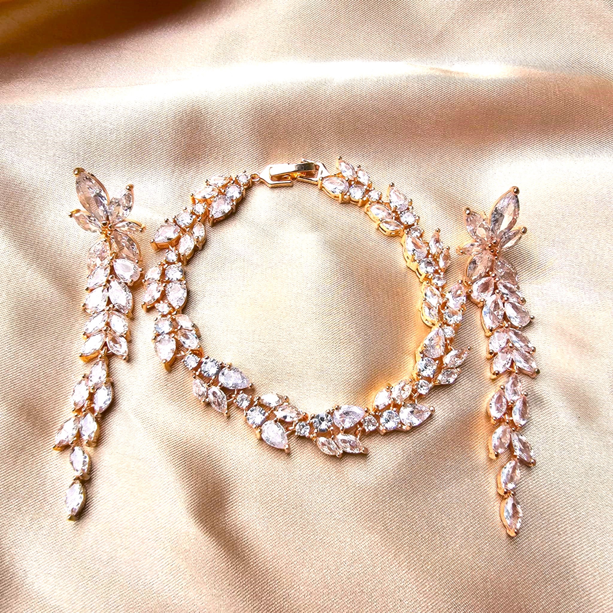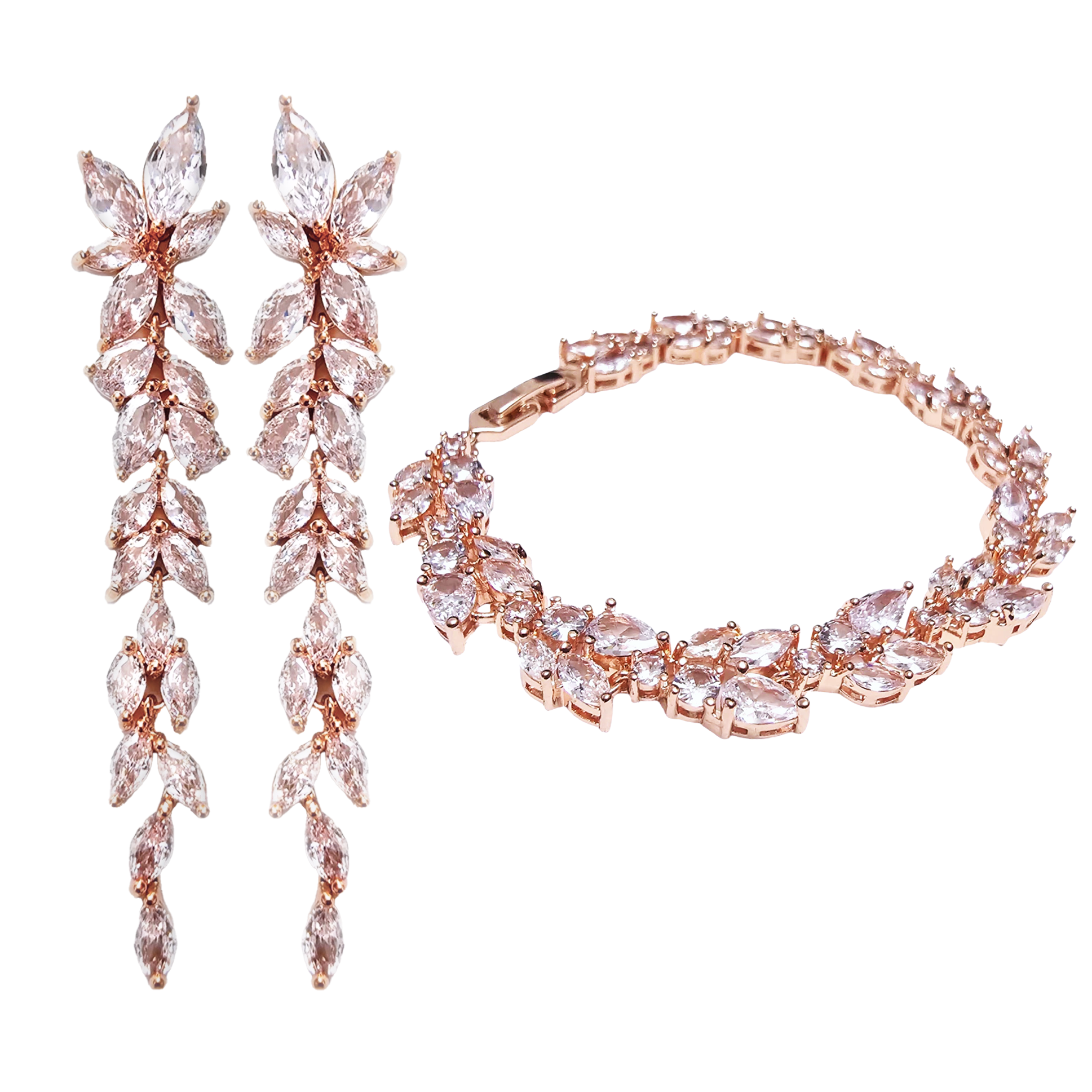 Wykonany w szlachetnym odcieniu różowego złota, zestaw ten doskonale uzupełnia zarówno tradycyjne, jak i nowoczesne stylizacje ślubne, dodając im niepowtarzalnego uroku.